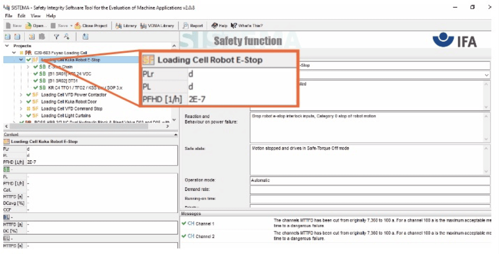 Les calculs précédents peuvent être fastidieux à réaliser et difficiles à documenter. La DGUV en Allemagne publie le SISTEMA « Outil logiciel d'Intégrité de Sécurité pour l'Evaluation des Applications Machines », qui est un logiciel gratuit permettant de créer des dispositifs et des fonctions de sécurité pour vérifier le PL du système. L'utilisateur modélise la structure en fonction de l'architecture de conception et remplit les valeurs MTTFD ou B10D, les données DC et CCF. De nombreux fabricants publient des bibliothèques de données SISTEMA contenant toutes les données pertinentes pour leurs produits qui peuvent être chargées dans la fonction de sécurité. Vous pouvez télécharger la bibliothèque SISTEMA de ROSS ci-dessous.