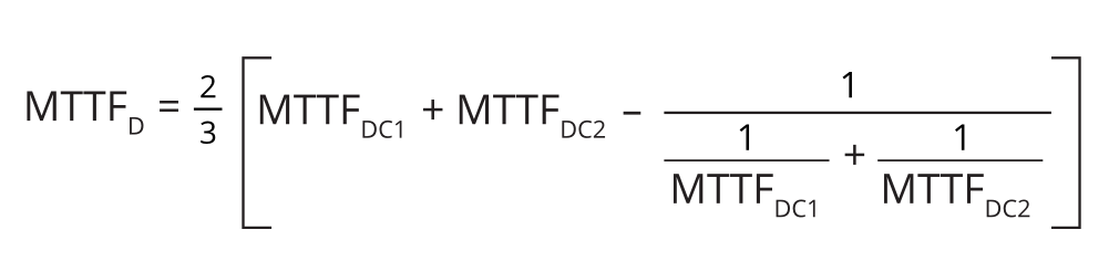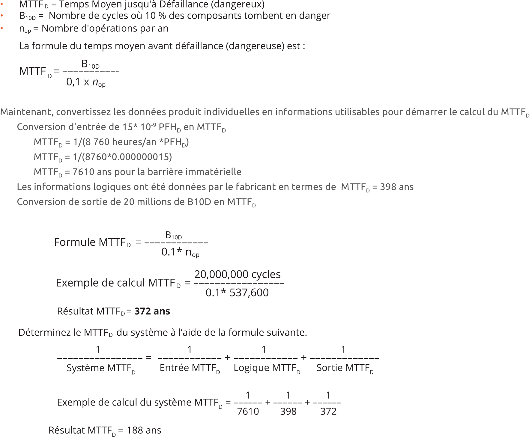 La deuxième étape du calcul du MTTFD d'un système de sécurité utilise le nop et la fiabilité calculés de chaque composant de la fonction de sécurité pour déterminer la fiabilité du système. Les rapports sur la fiabilité des composants varient d'un fabricant à l'autre et d'un type d'appareil à l'autre.