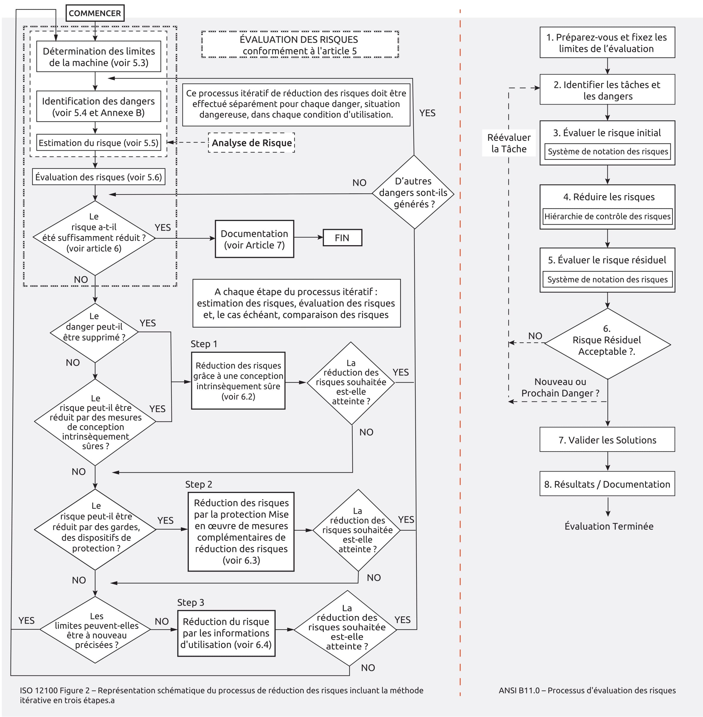 Les normes ISO 12100 et ANSI B11.0 fournissent des lignes directrices pour le processus d'évaluation des risques qui comprend l'estimation et la réduction des risques. Les organigrammes ci-dessous décrivent les processus d'évaluation des risques pour ISO 12100 et ANSI B11.0. Bien qu’ils paraissent légèrement différents, les deux processus sont presque identiques.