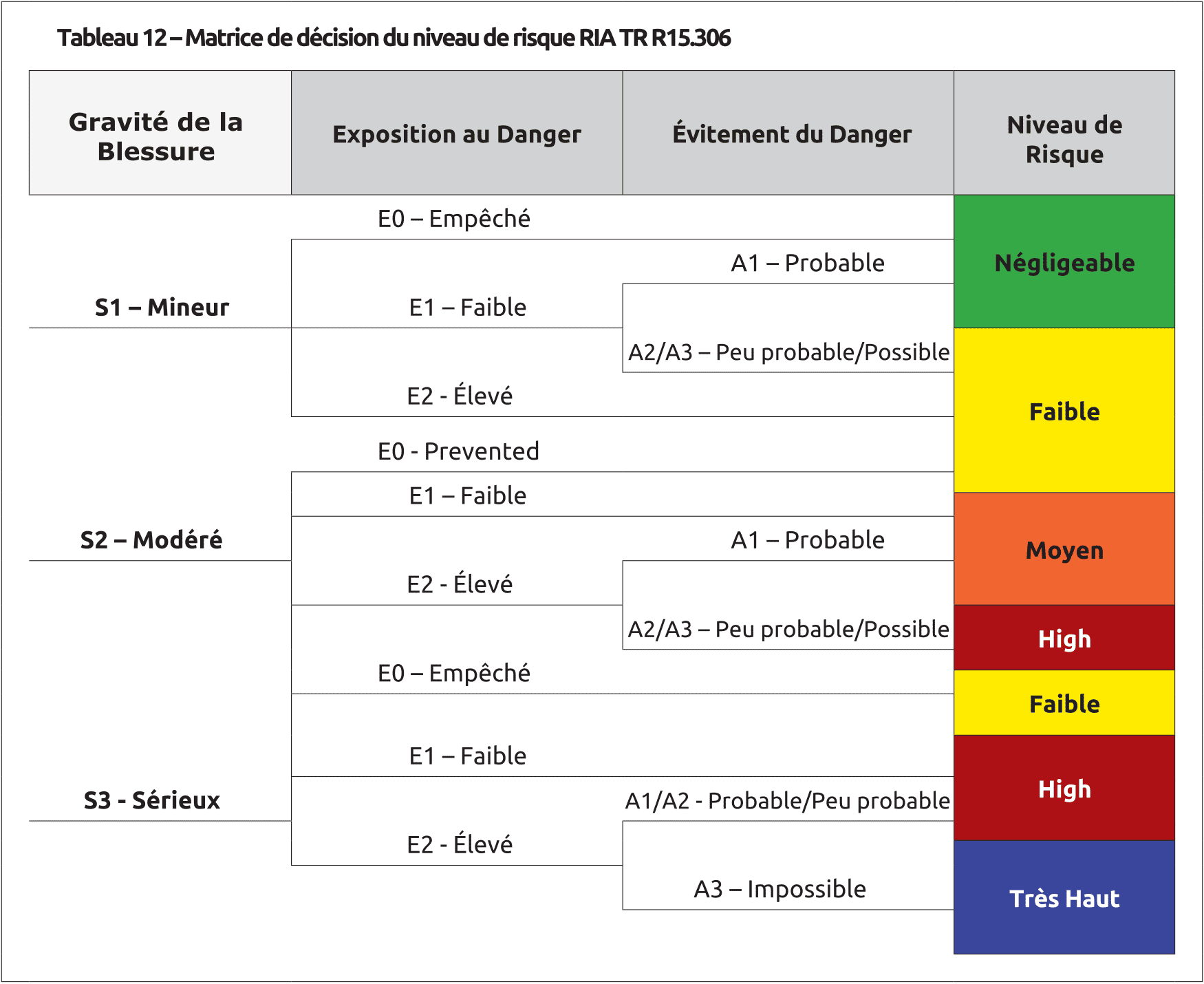 ANSI/RIA TR15.306 utilise une approche hybride similaire aux méthodes ANSI B11.0 et ISO 13849-1 pour déterminer le niveau de performance et la catégorie requis. Elle comporte trois facteurs comme la méthodologie ISO 13849-1, mais elle aboutit à des termes similaires à l'approche ANSI B11.0.